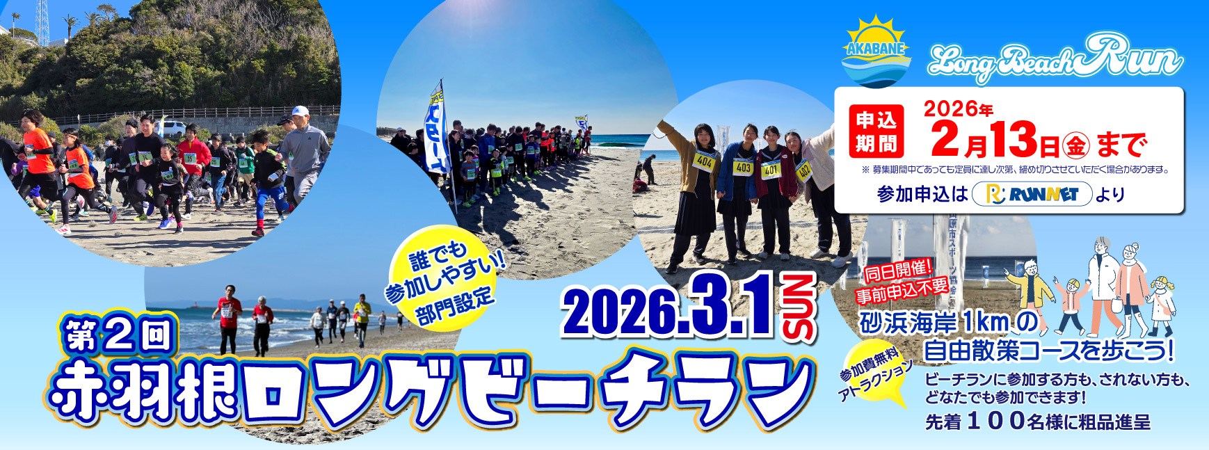 今年度は「皆で走ろうロングビ-チ」第2回赤羽根ロングビ-チラン2026大会を開催致します。全国のランナーズの皆様、ご家族、ご友人の皆様を赤羽根ロングビ-チにお迎えして開催出来る事に感謝申し上げます。