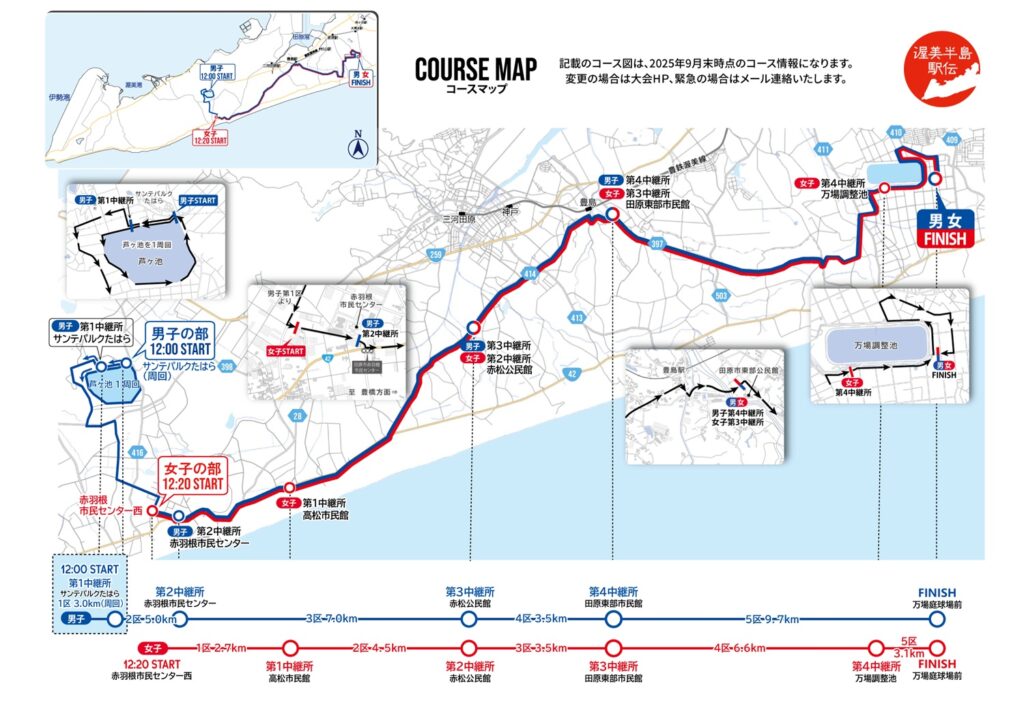 - 【繰上げスタート】 男子は赤羽根市民センター(男子第2中継所)において、先頭から10分遅れたチームは繰り上げスタートとする。また、田原東部市民館(男子第4・女子第3中継所)において、先頭から20分遅れたチームは繰り上げスタートとする。
