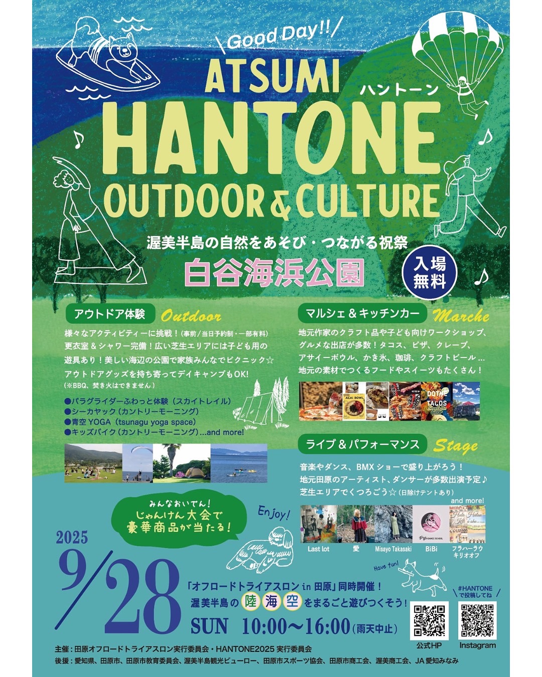 HANTONEは、カヤック、パラグライダー、自転車など陸海空をあそぶアウトドアアクティビティと、キッチンカー、マルシェ、ステージイベントを通じて、渥美半島の自然と、ひととつながり、たくさんのいのちを感じ祝福するお祭りです。
